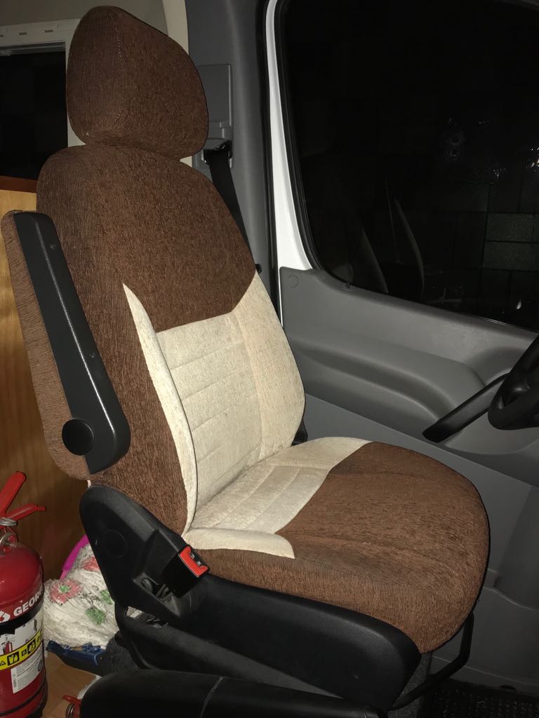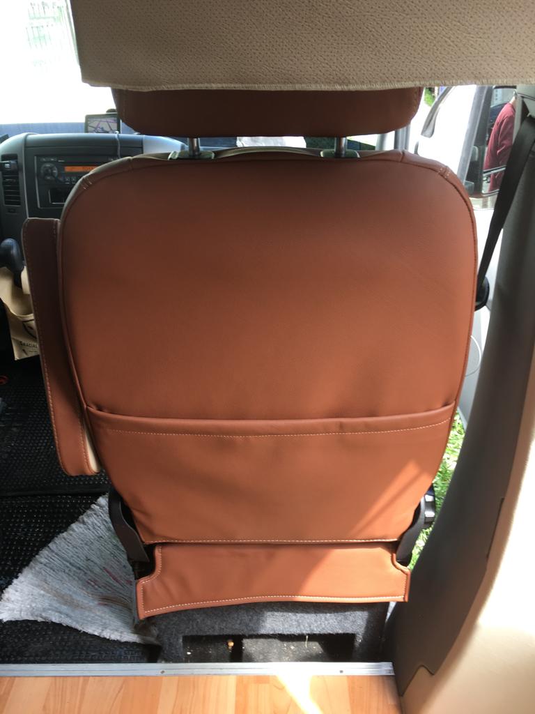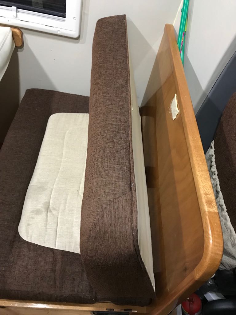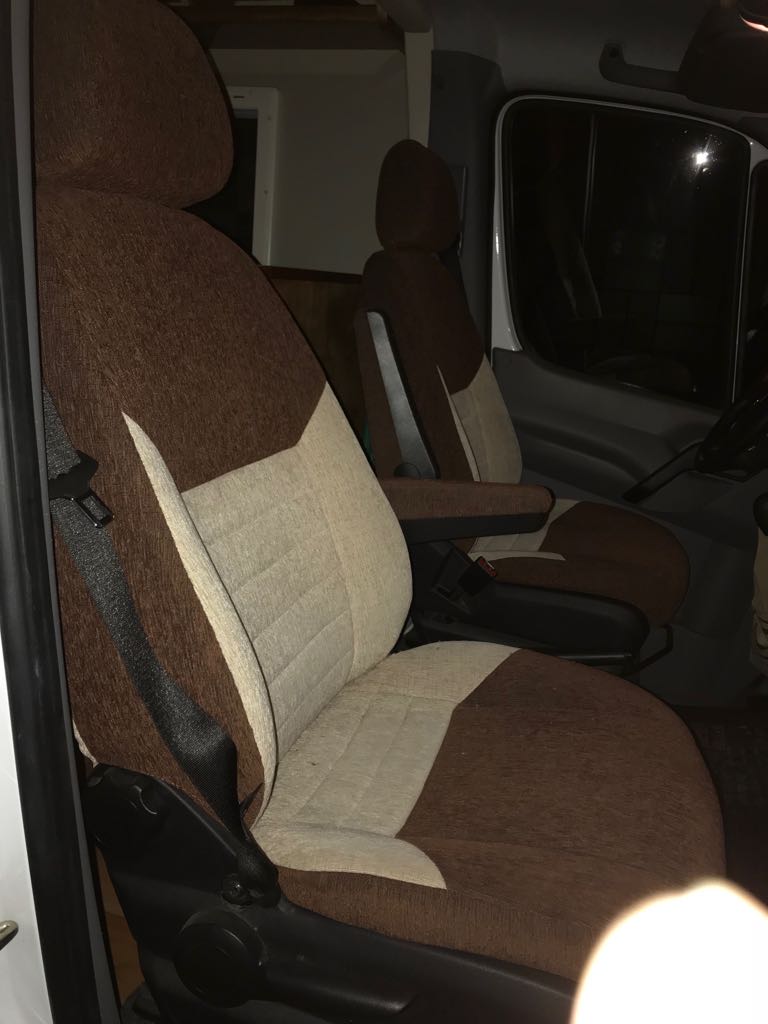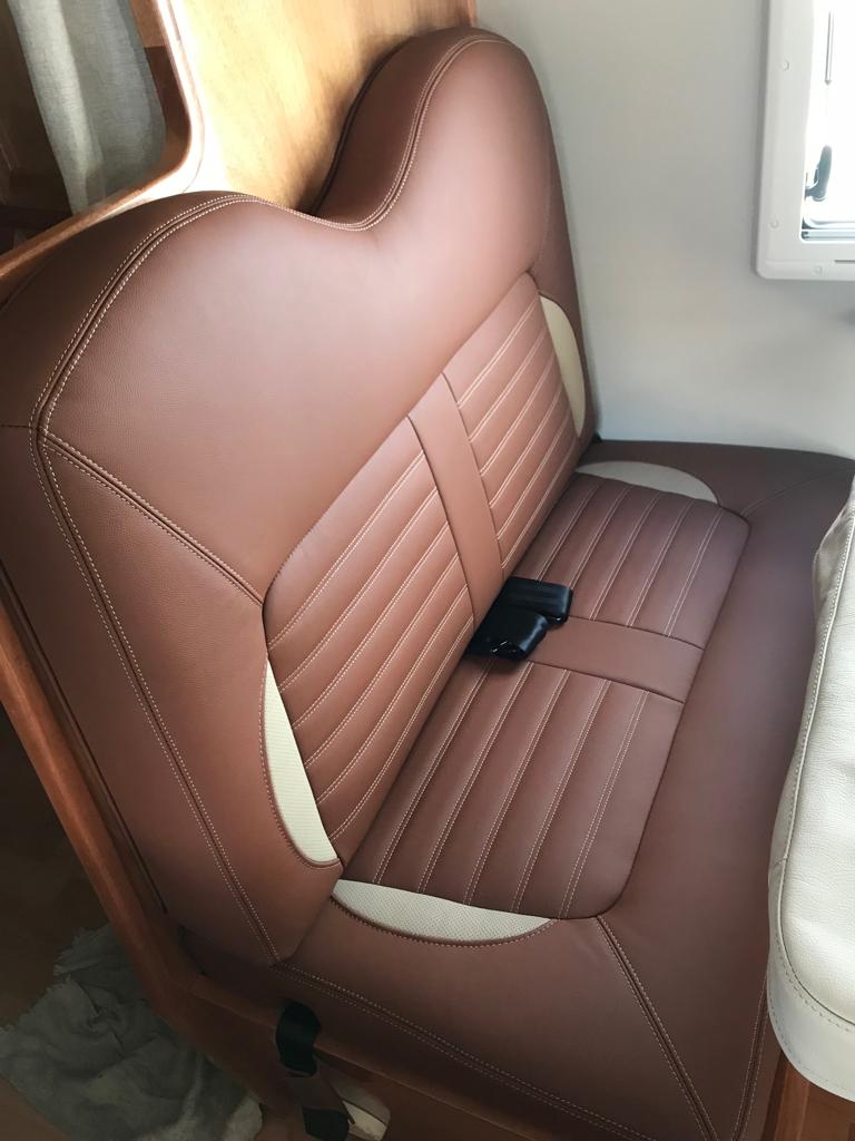 Se tapizaron butacas delanteras y sillones traseros, que se sujetan a la pared de madera de la unidad con sistema de imane. Además, el butaquín para subir a la cama.